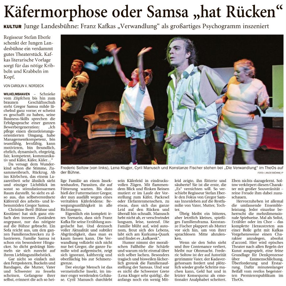 Franz Kafkas "Verwandlung" als großartiges Psychogramm inszeniert. [...] Dafür minutenlanger Beifall vom restlos begeisterten Premierenpublikum.